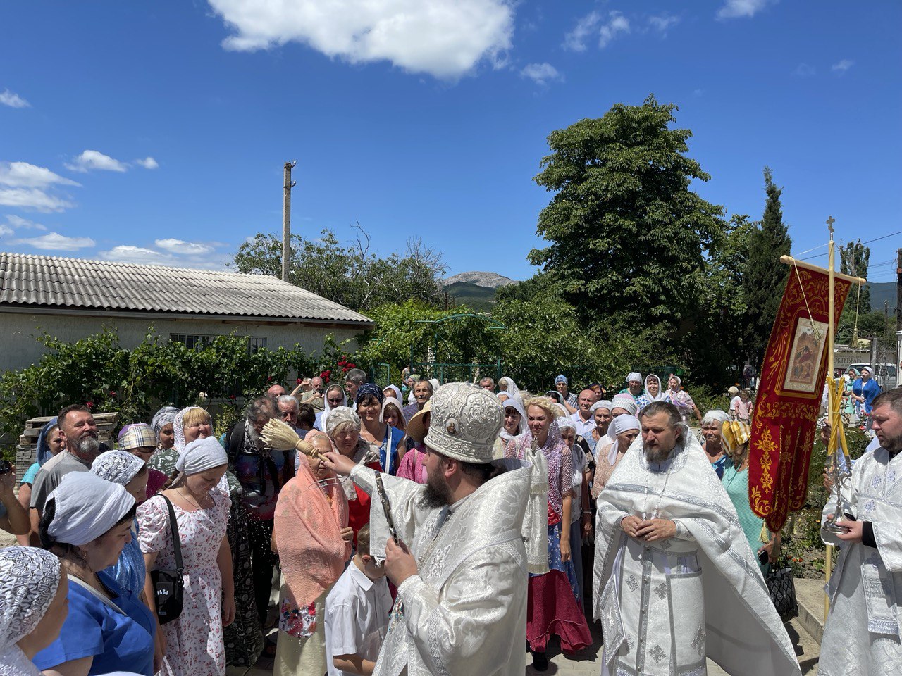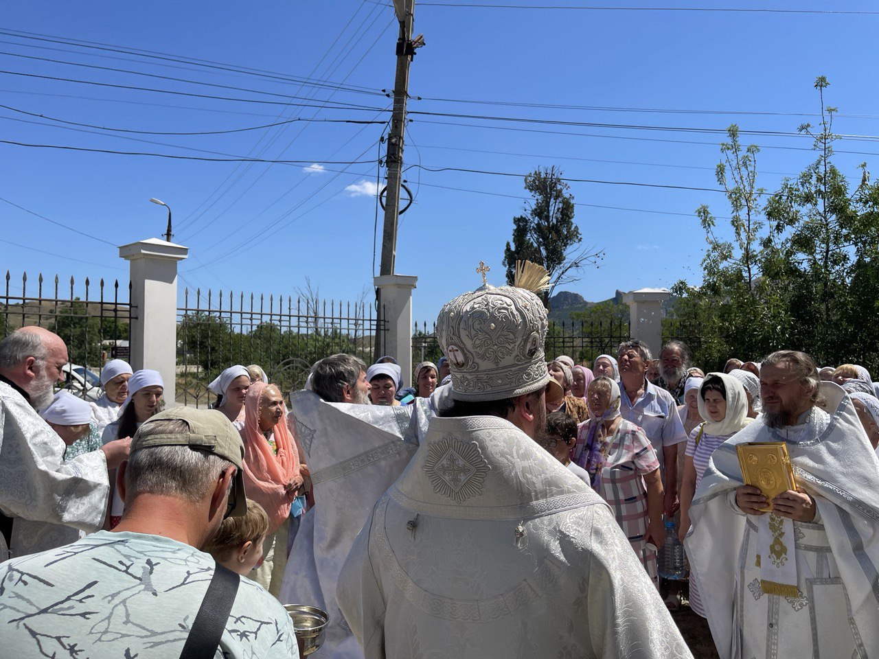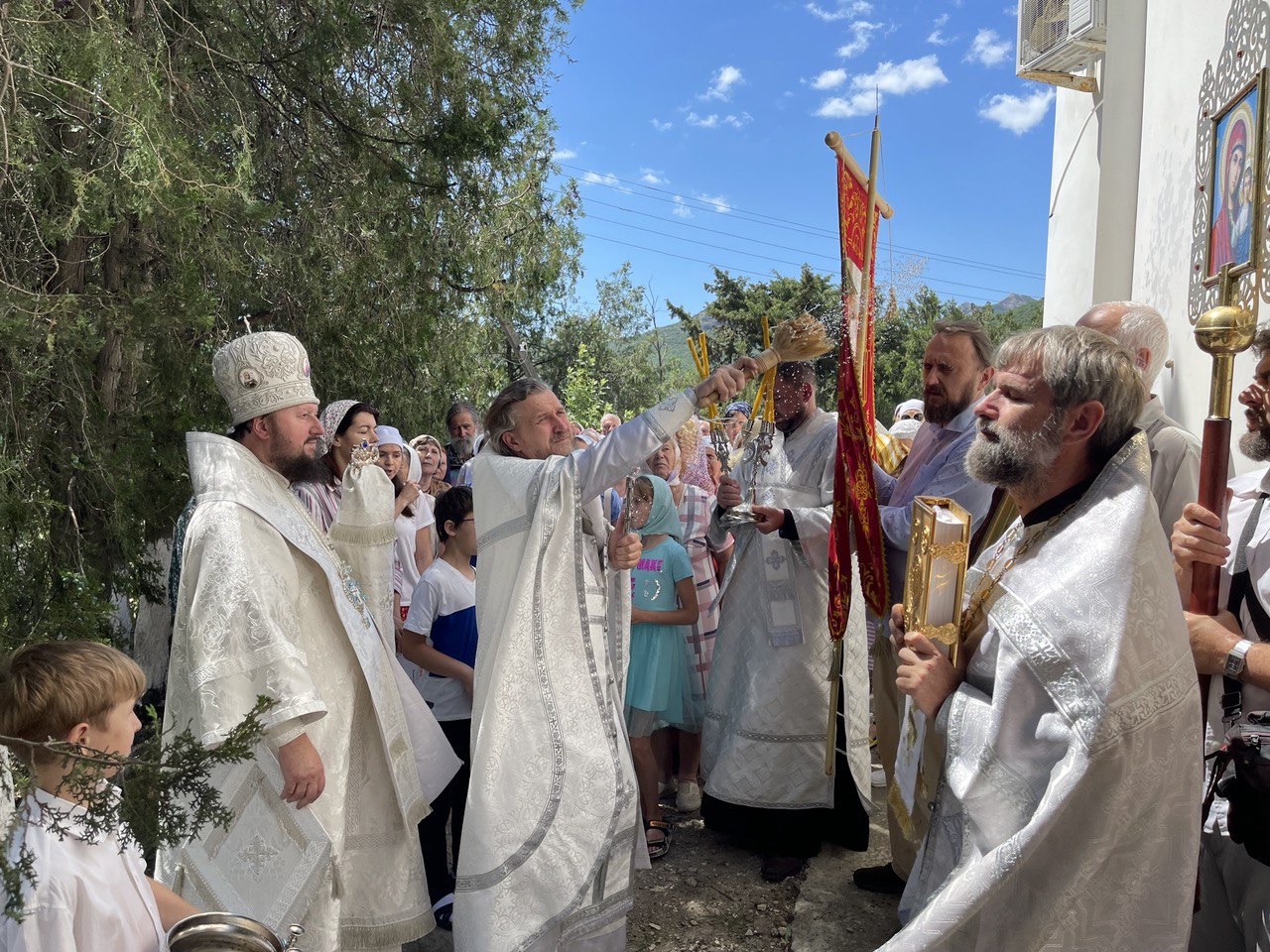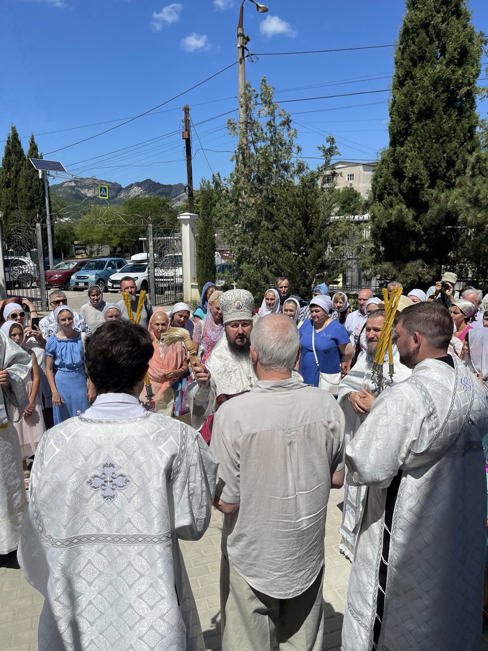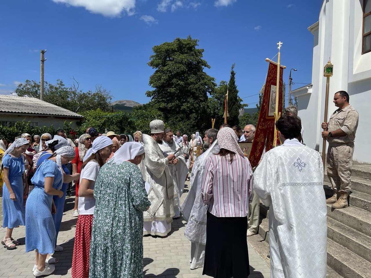 Владыка Агафон передал священнослужителям, прихожанам и гостям храма поздравление с престольным праздником от Высокопреосвященнейшего митрополита Феодосийского и Керченского Платона и обратился с проповедью о Вознесении Господа.