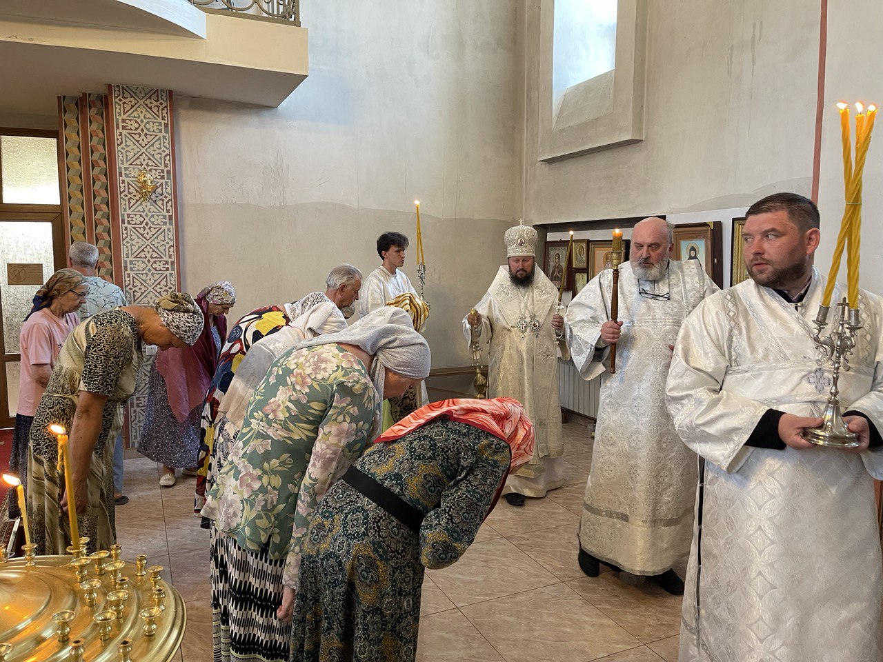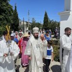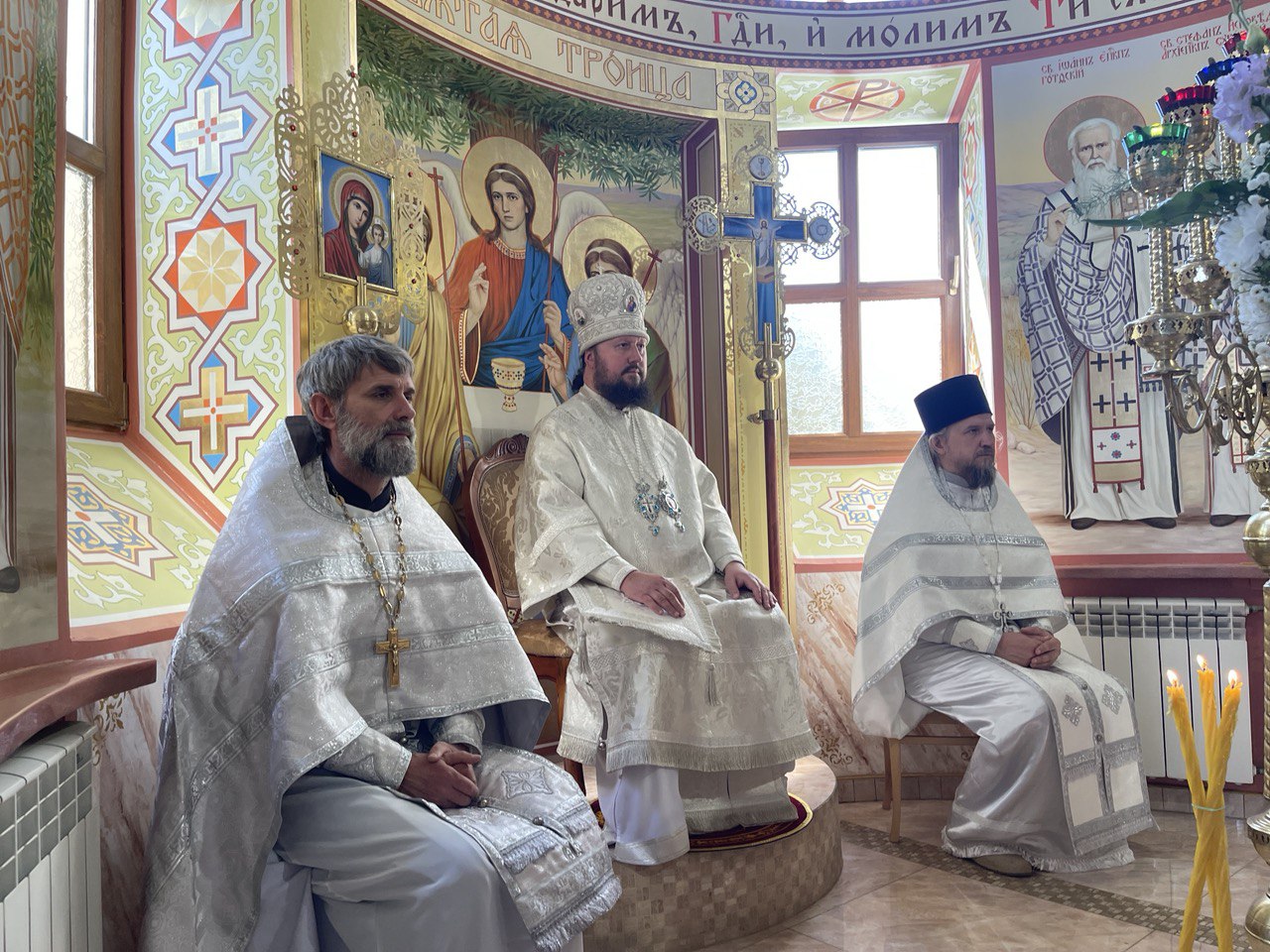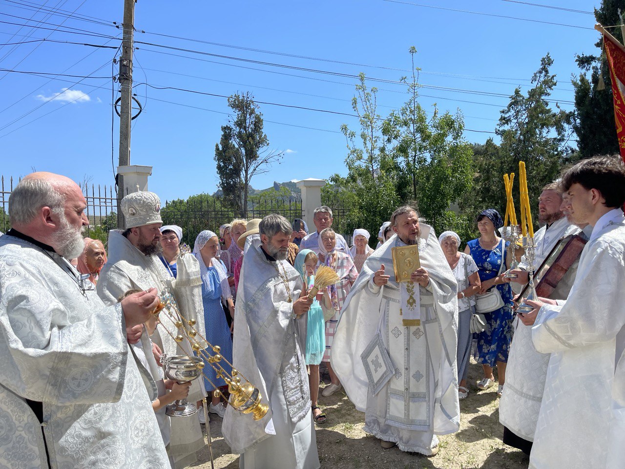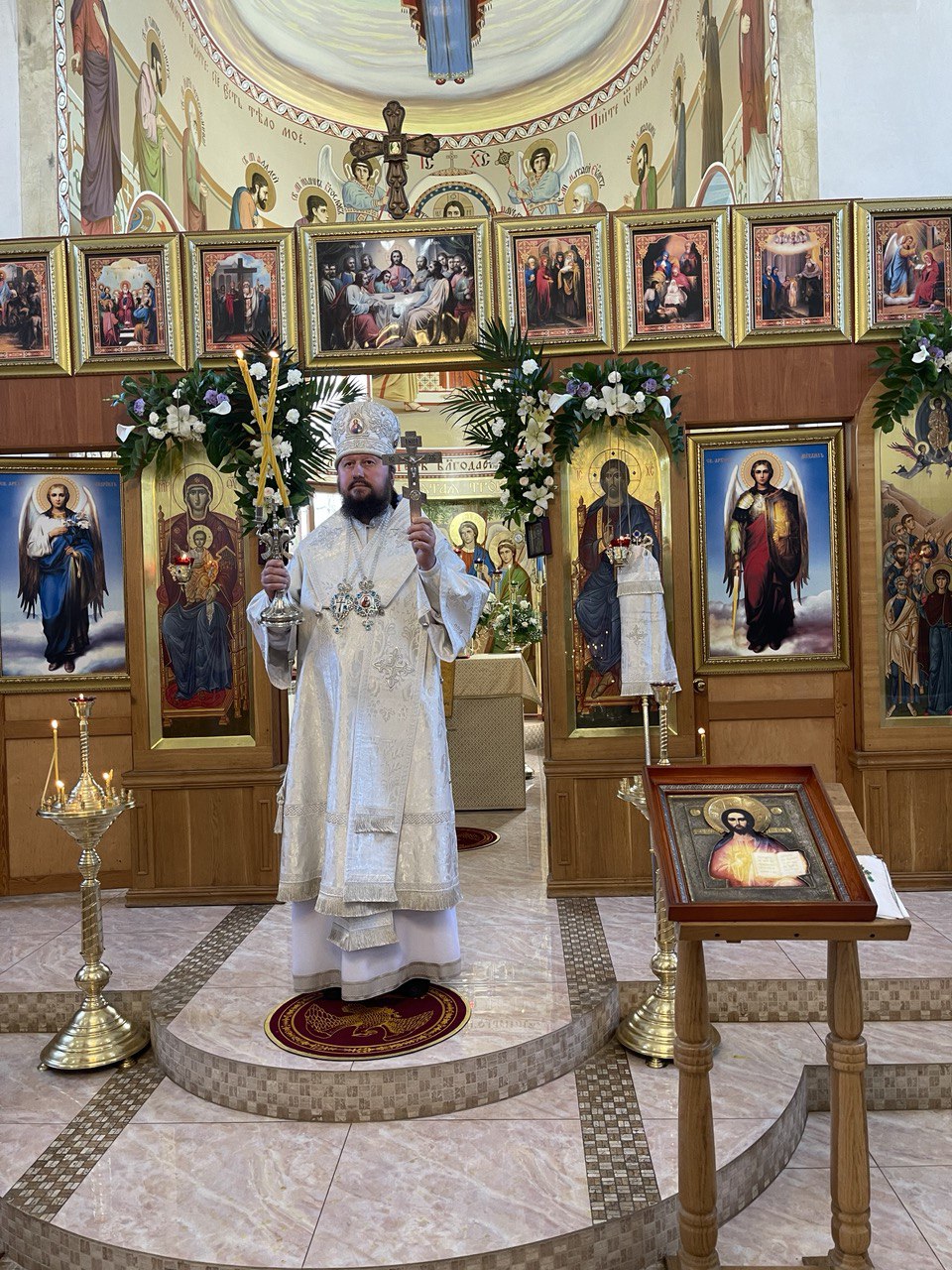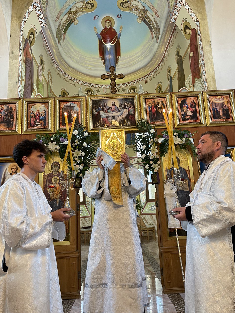 Владыка Агафон передал священнослужителям, прихожанам и гостям храма поздравление с престольным праздником от Высокопреосвященнейшего митрополита Феодосийского и Керченского Платона и обратился с проповедью о Вознесении Господа.