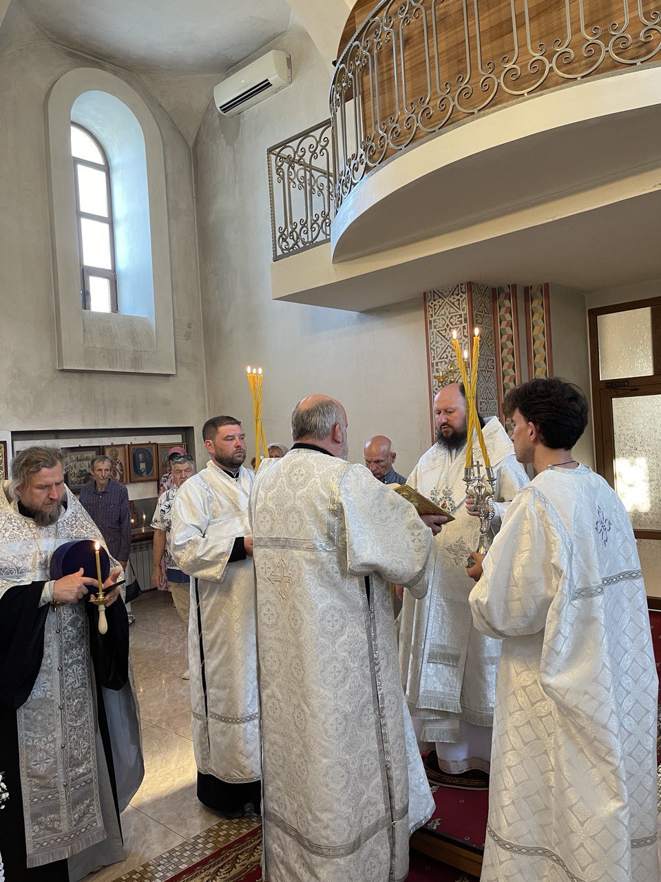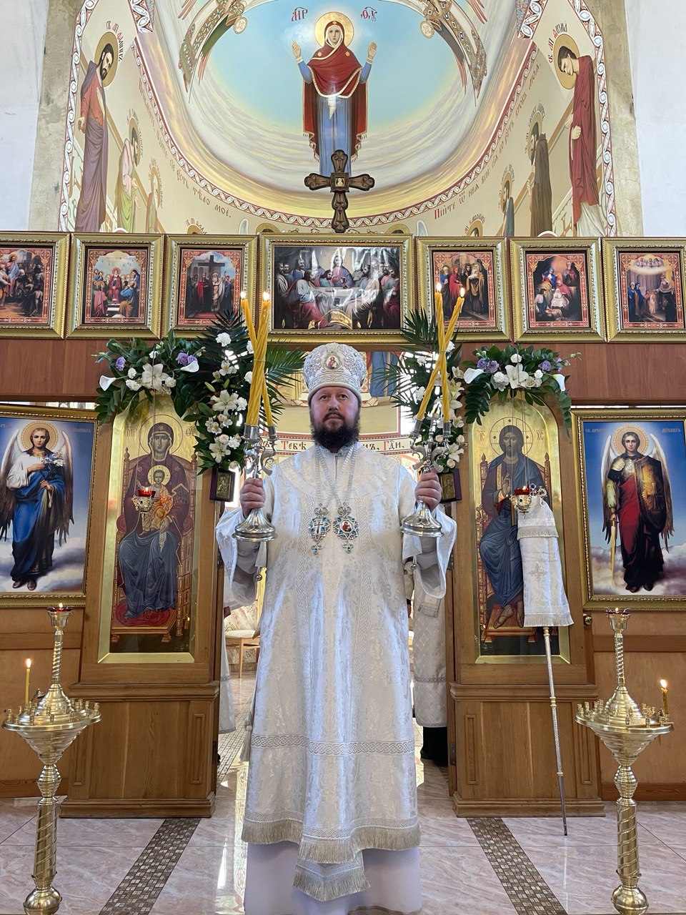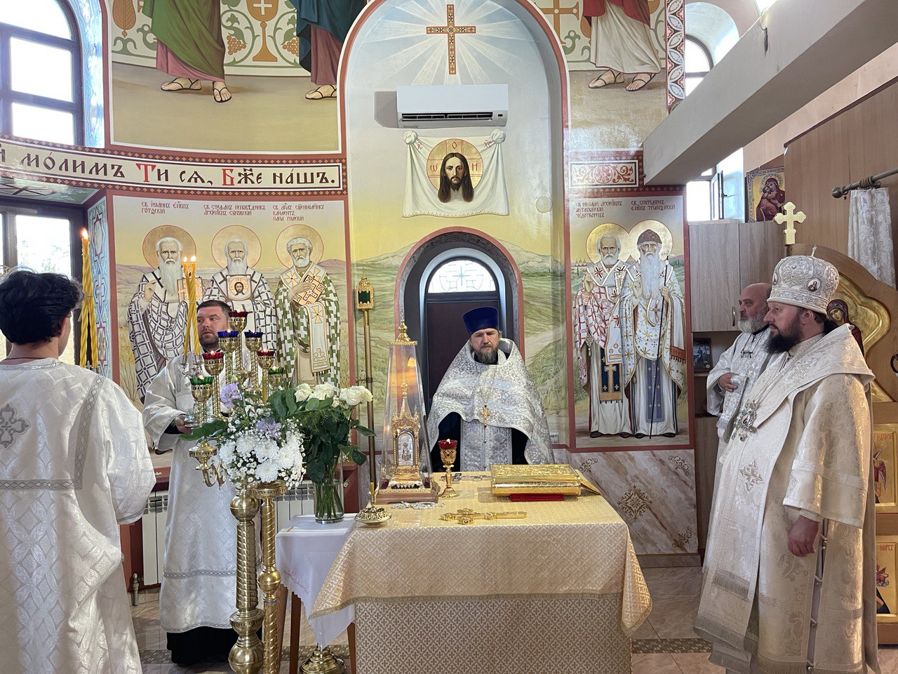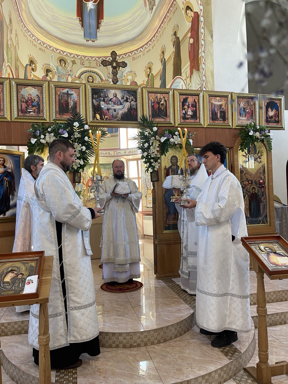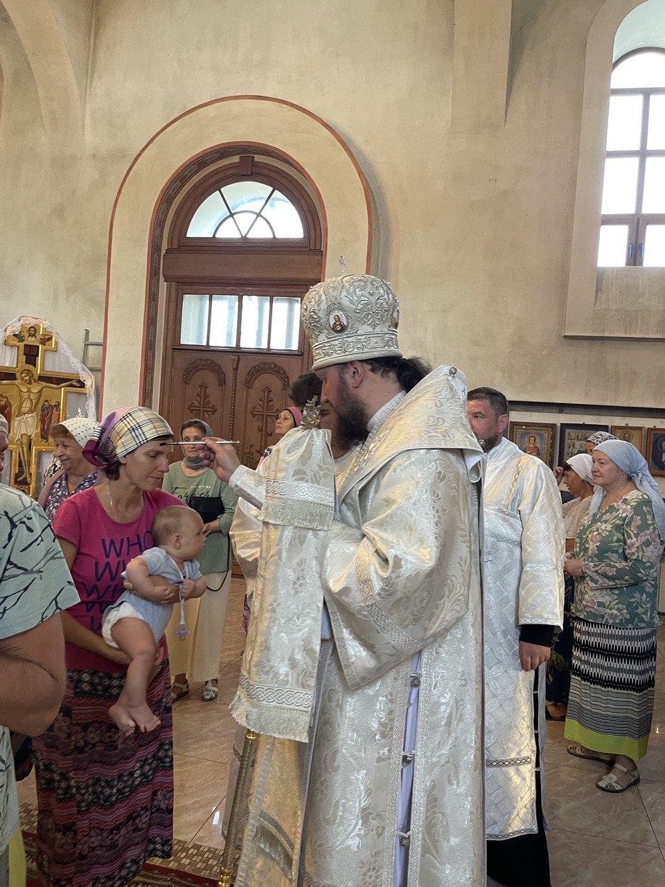 Владыка Агафон передал священнослужителям, прихожанам и гостям храма поздравление с престольным праздником от Высокопреосвященнейшего митрополита Феодосийского и Керченского Платона и обратился с проповедью о Вознесении Господа.