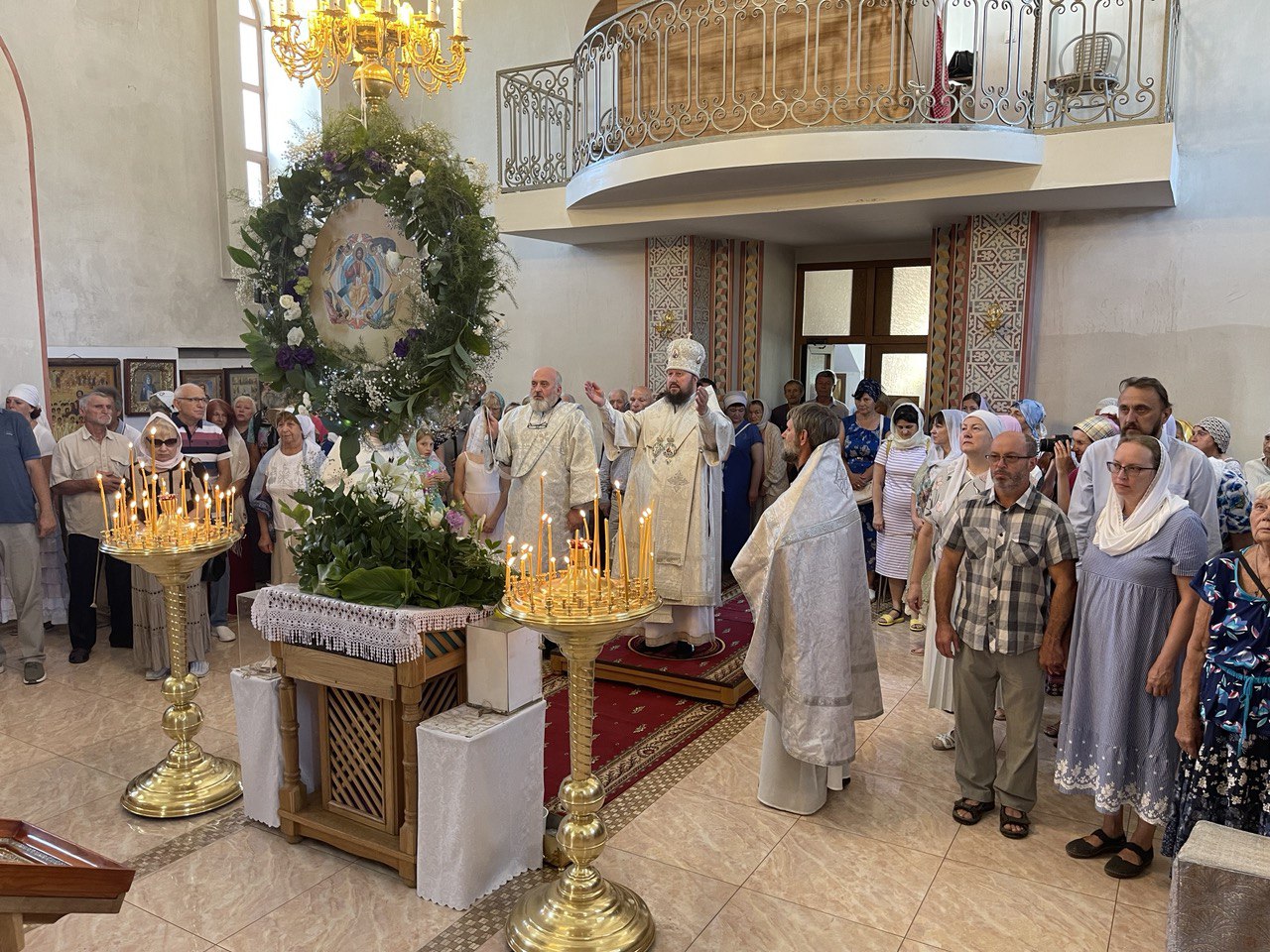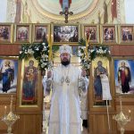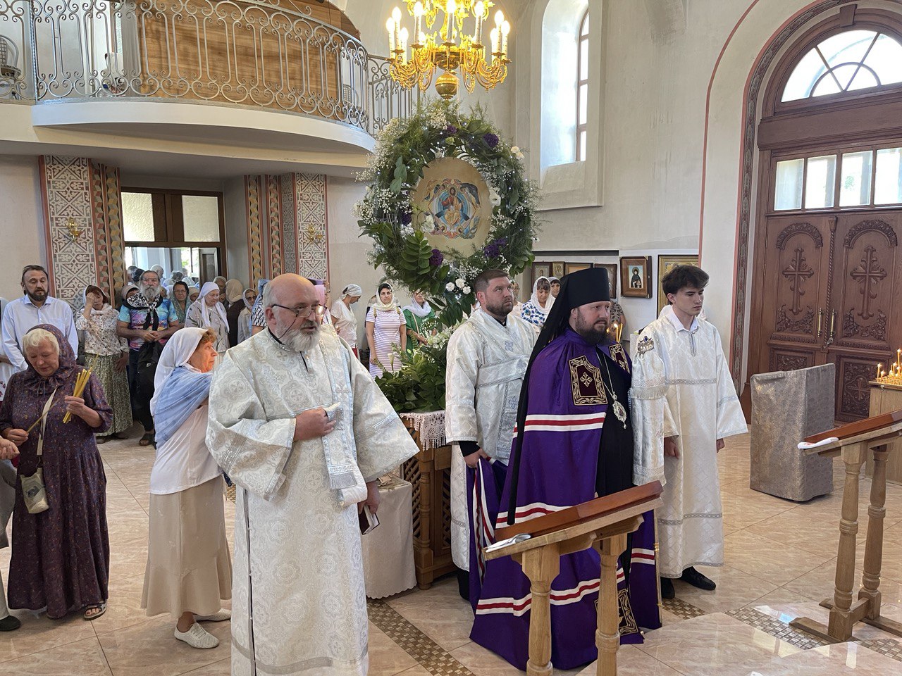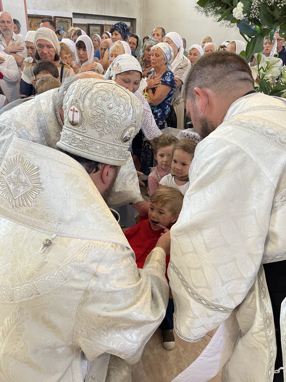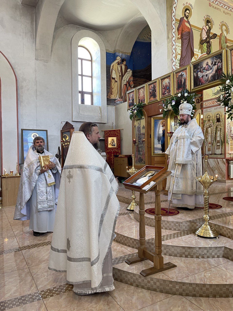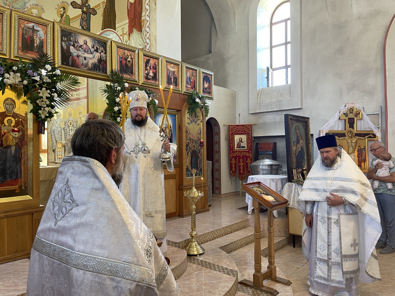 Владыка Агафон передал священнослужителям, прихожанам и гостям храма поздравление с престольным праздником от Высокопреосвященнейшего митрополита Феодосийского и Керченского Платона и обратился с проповедью о Вознесении Господа.